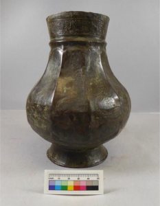 The third object is an Islamic style brass jug from the Oriental Museum. The jug is inlayed with copper and silver and decorated with calligraphy and animal figures. The handle is missing, and holes are filled with solder. There are several cracks in different areas. The top rim is slightly deformed. Also, there are creamy white deposits on the interior surface.