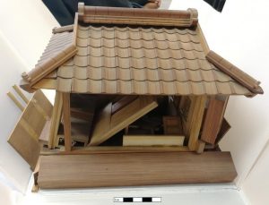 The last object is quite complex. It is a Japanese doll house with three seated dolls. The major structure is made of bamboo. The square house has a small covered veranda running around the outside and small external, hinged storage cupboards. The house is in very poor condition with many of the internal partitions and furniture broken or out of place. Many pieces are distorted due to RH and temperature changes and bad repairs.