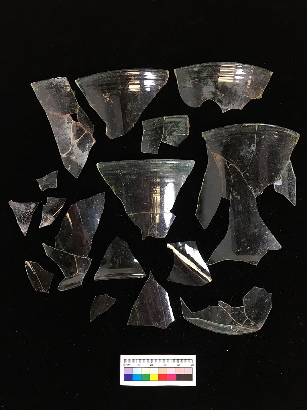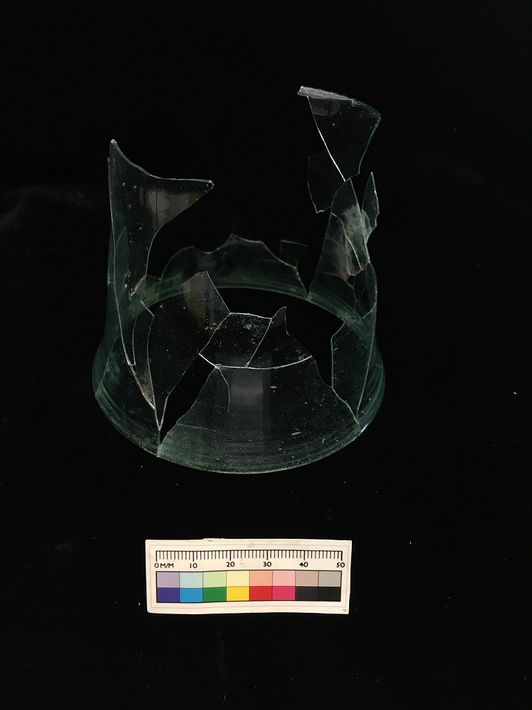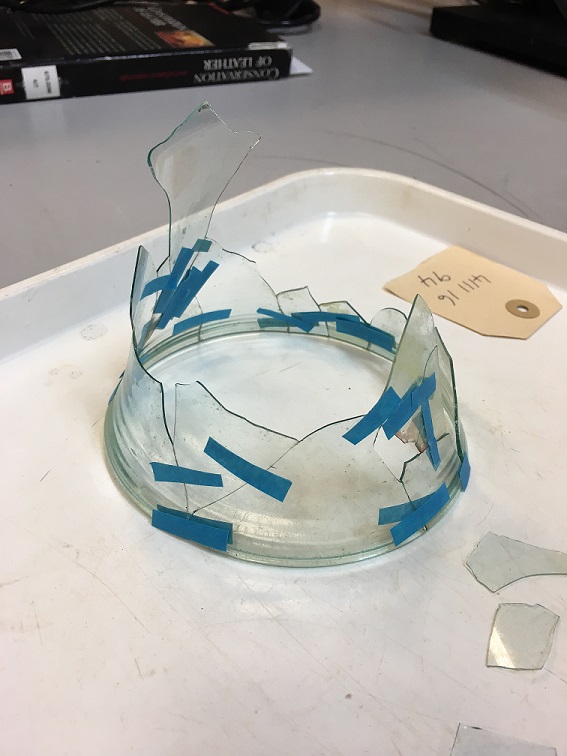 After several hours and advice from Vicky and my classmates I have successfully matched nearly all of the glass pieces (Fig3). To my surprise there was a full rim, some body parts and small parts of the base which allowed me to measure the height and the diameter of the container. The newly re-assembled glass container is short and very wide; it makes me wonder what it was used for in the past. Any suggestions?
