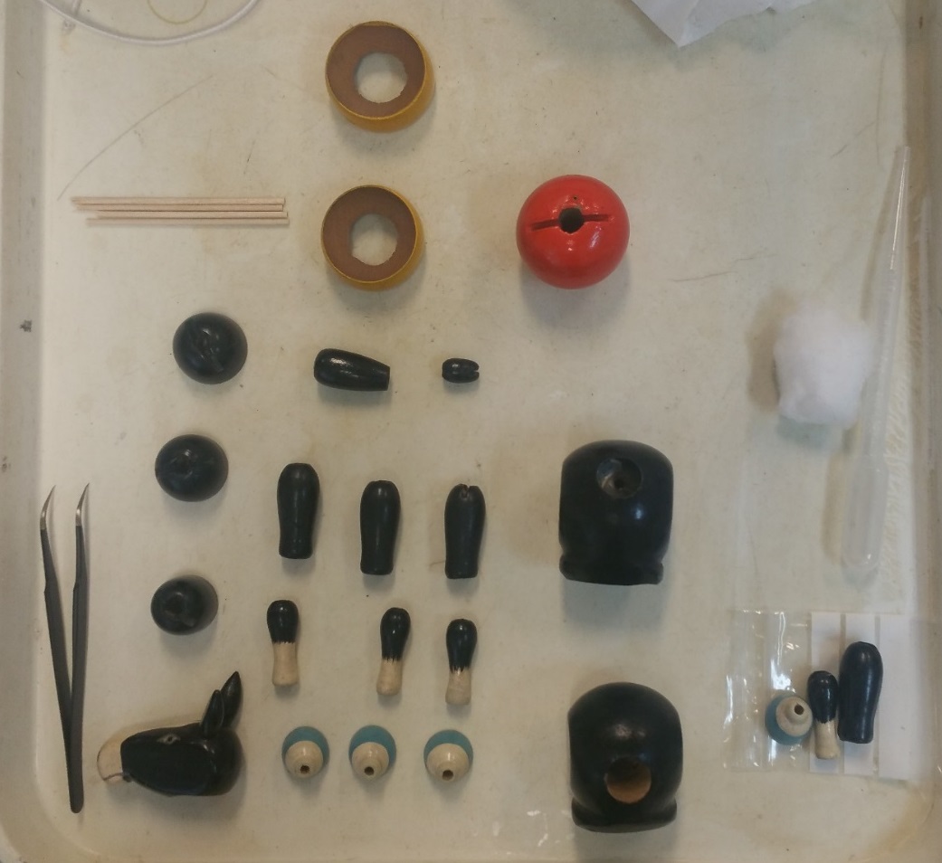 The paint layer on all components but the hooves was in good condition and had only suffered some soiling from use and some losses from the rubbing of the joints during play. The secret to the object’s original mechanism lay within the wooden body, visible through the openings of the components but frustratingly difficult to clearly access. As a fairly routine procedure, the most intact section and two other selected components were x-rayed to reveal how the toy had been originally threaded.